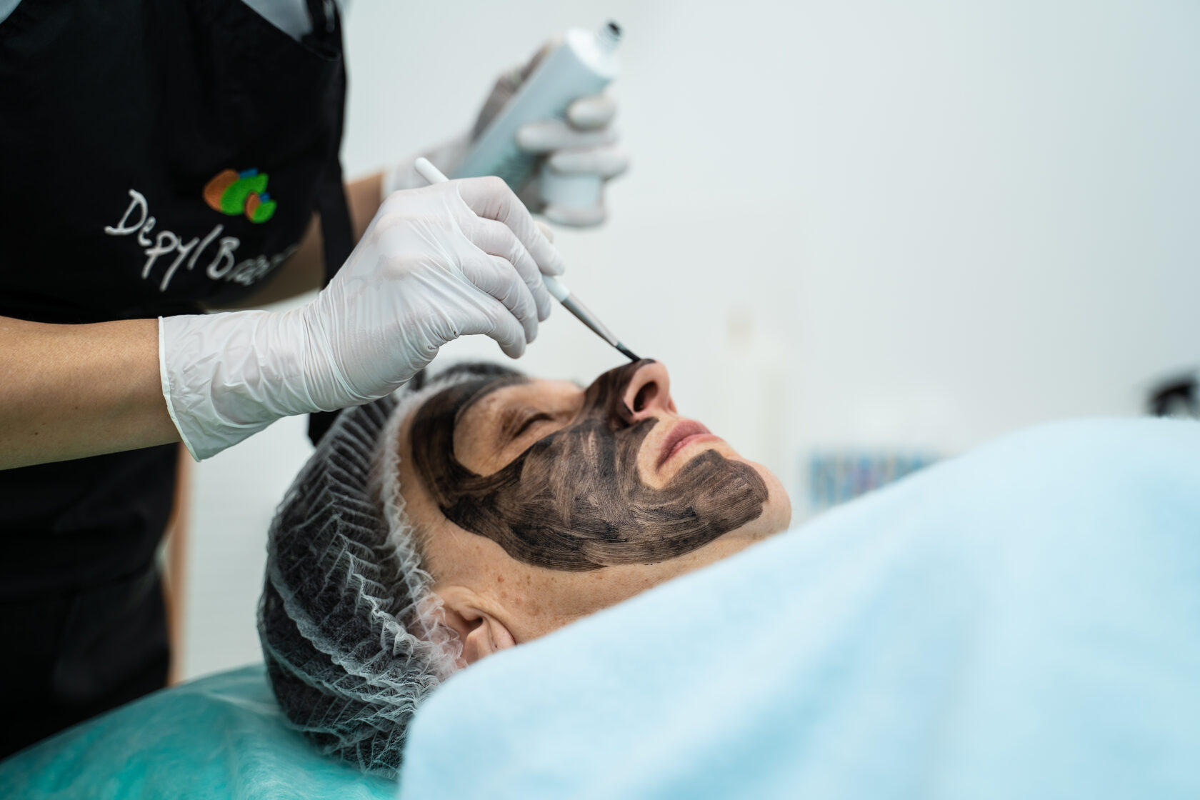 На лицо наносится карбоновый гель — он проникает в поры.